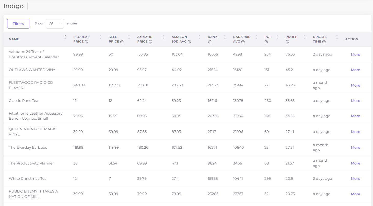 可以快速看到indigo的商品列表,可以看到商品的原价,现在价格,亚马逊售卖价格,亚马逊90天售卖价格,亚马逊此商品的rank,90天rank,通过系统计算之后ROI 和利润,还有更新时间。
